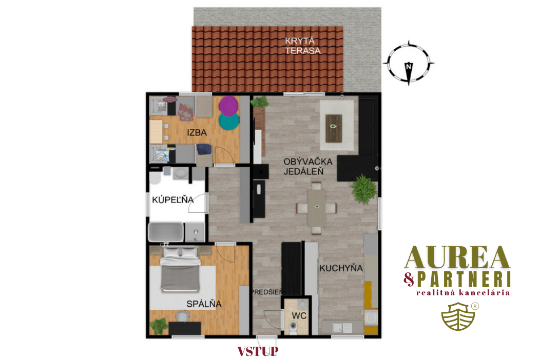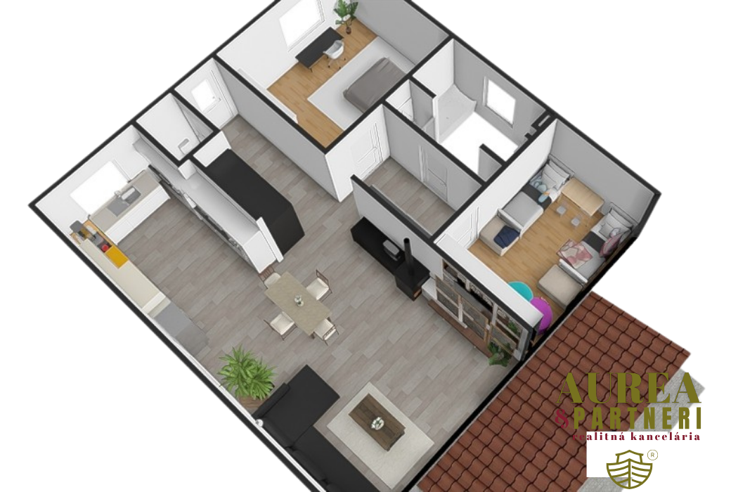 - Miestnosti: 3+kk (2 izby/spálňa + detská/ + obývačka prepojená s jedálňou a modernou kuchyňou), ´s priamy vstupom na krytú terasu o výmere